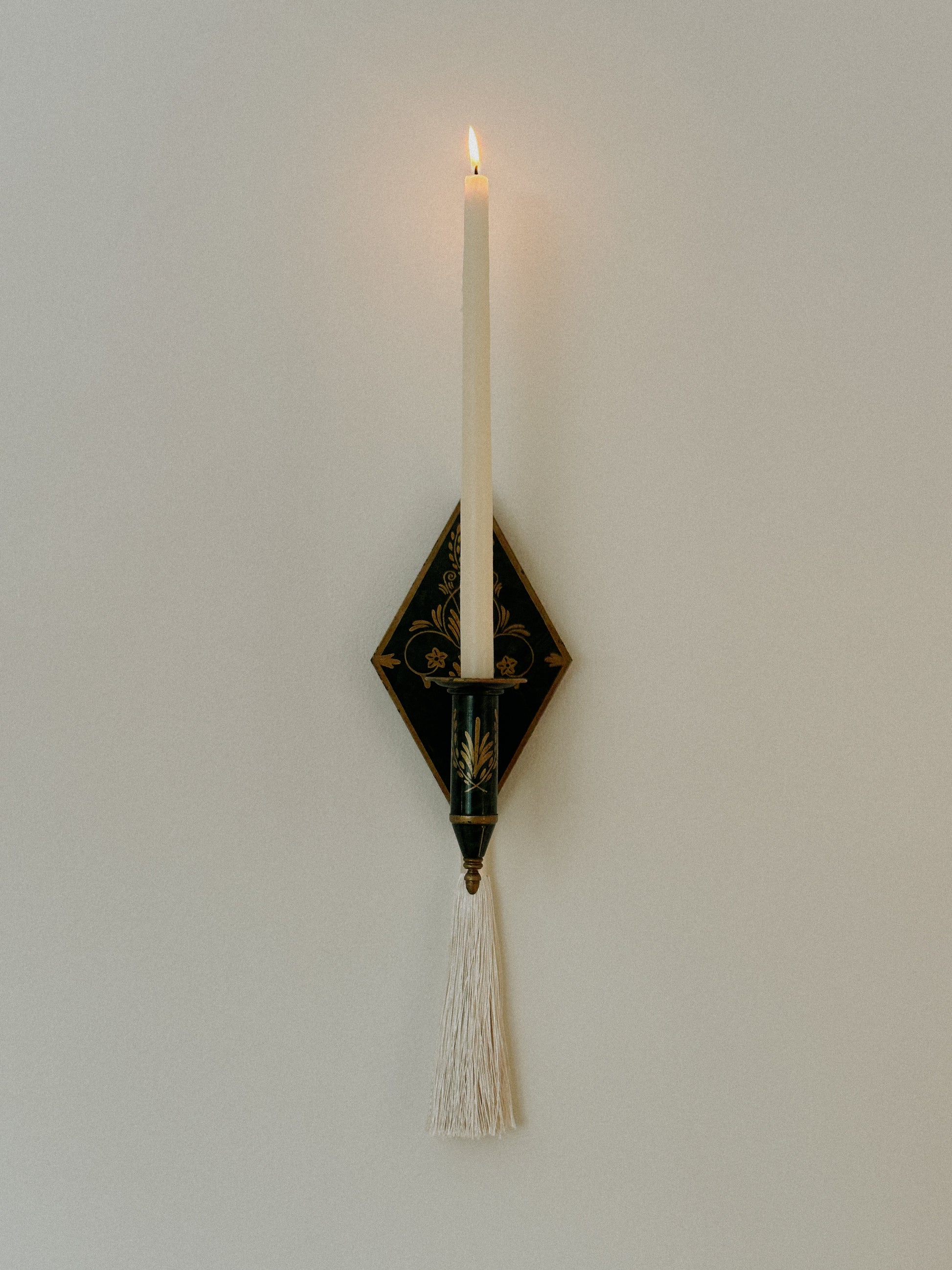 An Art Deco wall mounted candle sconce crafted in metal with deep green enamel and hand-applied gilt detailing. Diamond backplate with foliate motifs, finished with a sculptural candle cup and tassel accent below. 11.5” high and 5”’at widest. Very good vintage condition.