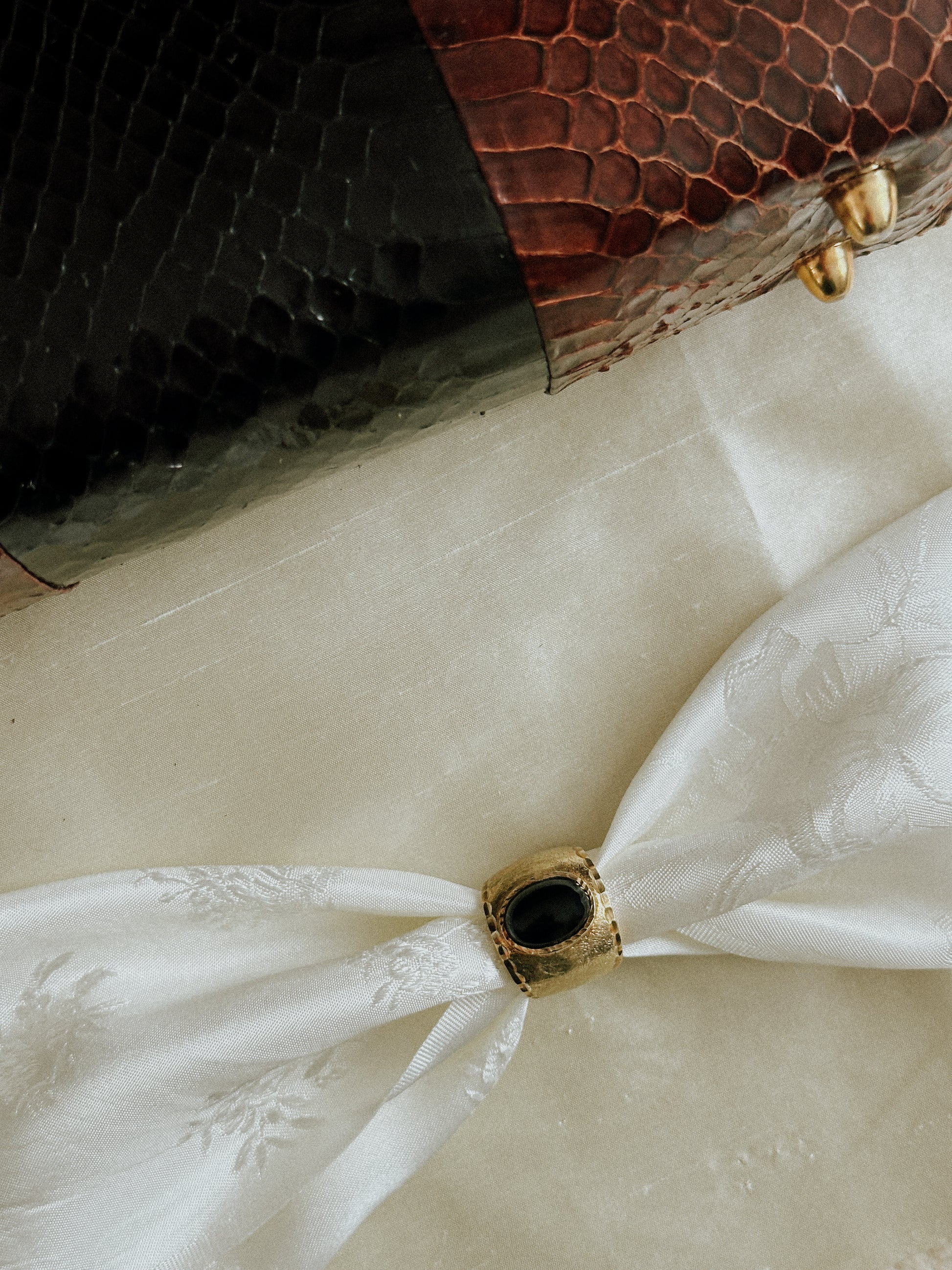 A stunning size 7 gold plated and onyx cabochon statement ring. Italy. .75 wide and in good vintage condition.