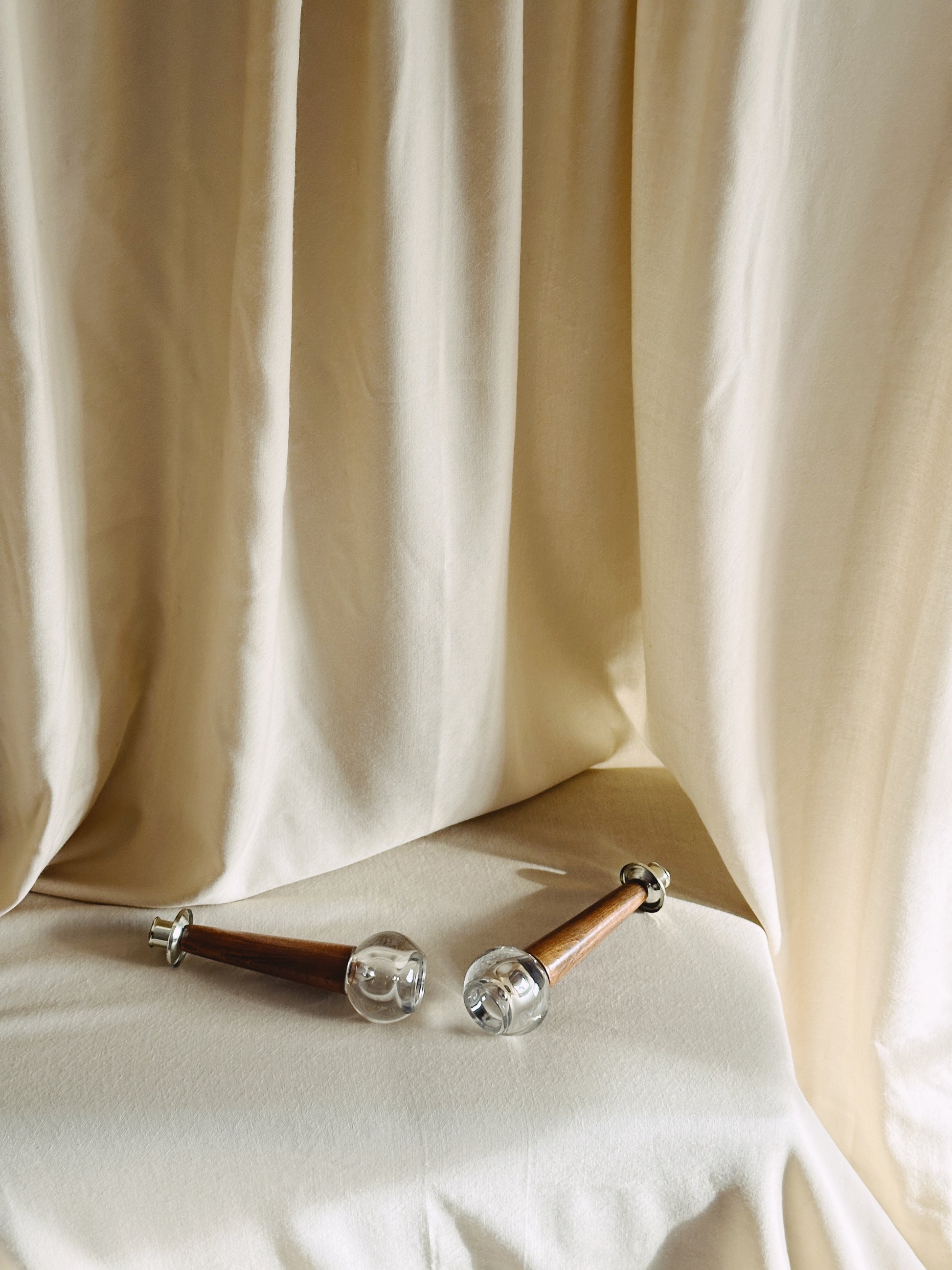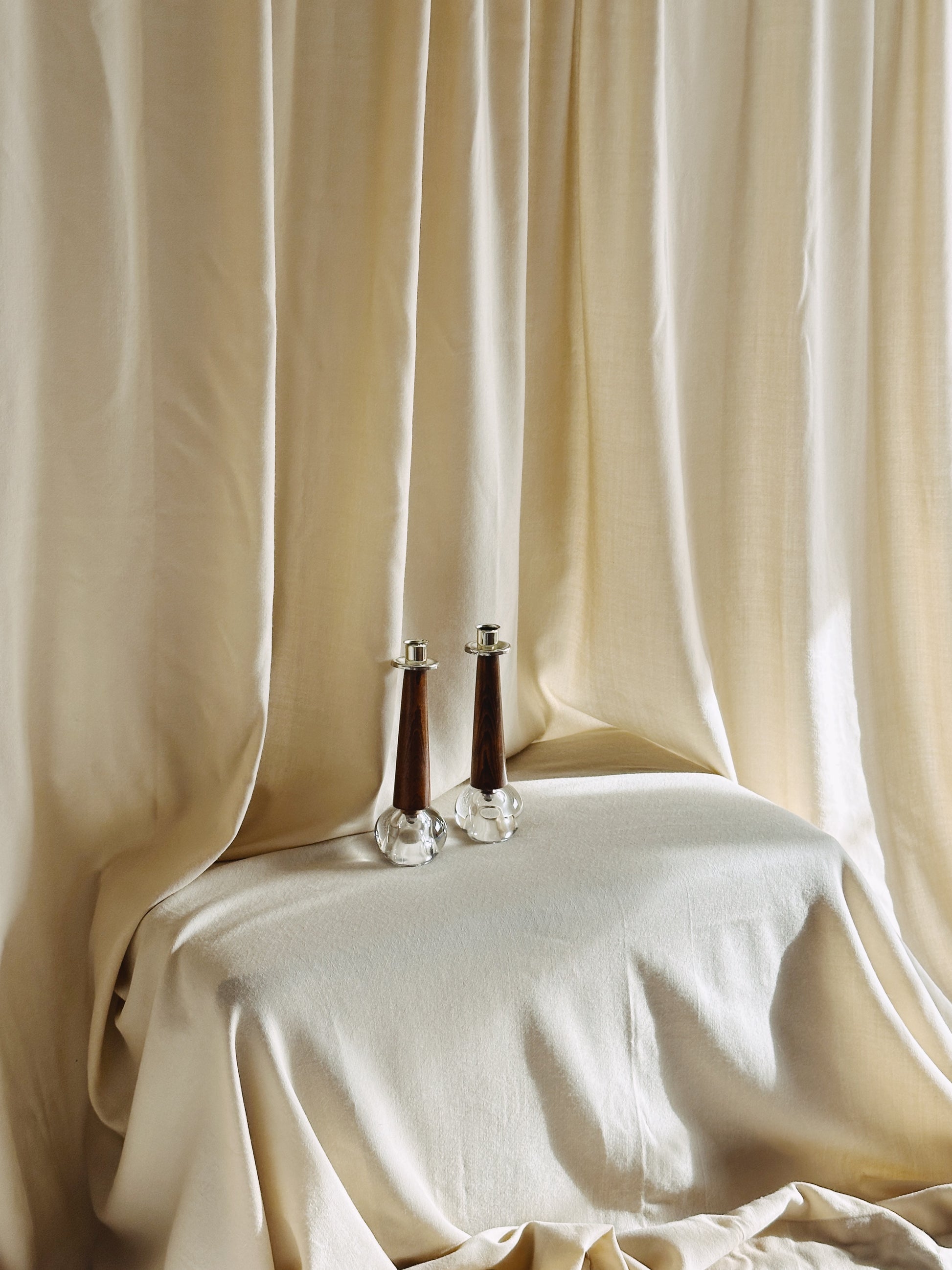 A pair of mid-century wood, lucite, and silver tone candlestick holders. Overall good condition with wear consistent with age. 10” tall and holds a standard taper candle.