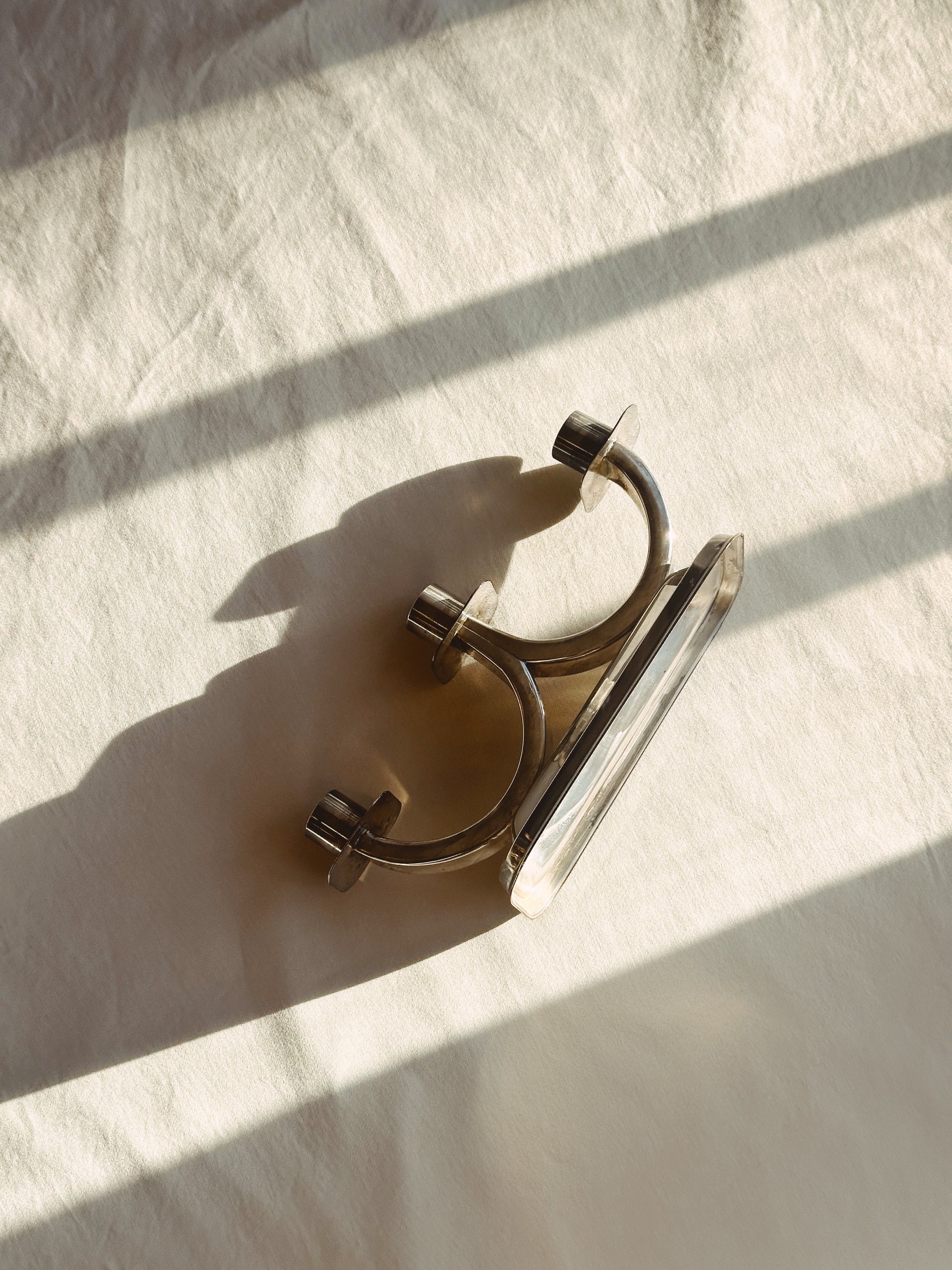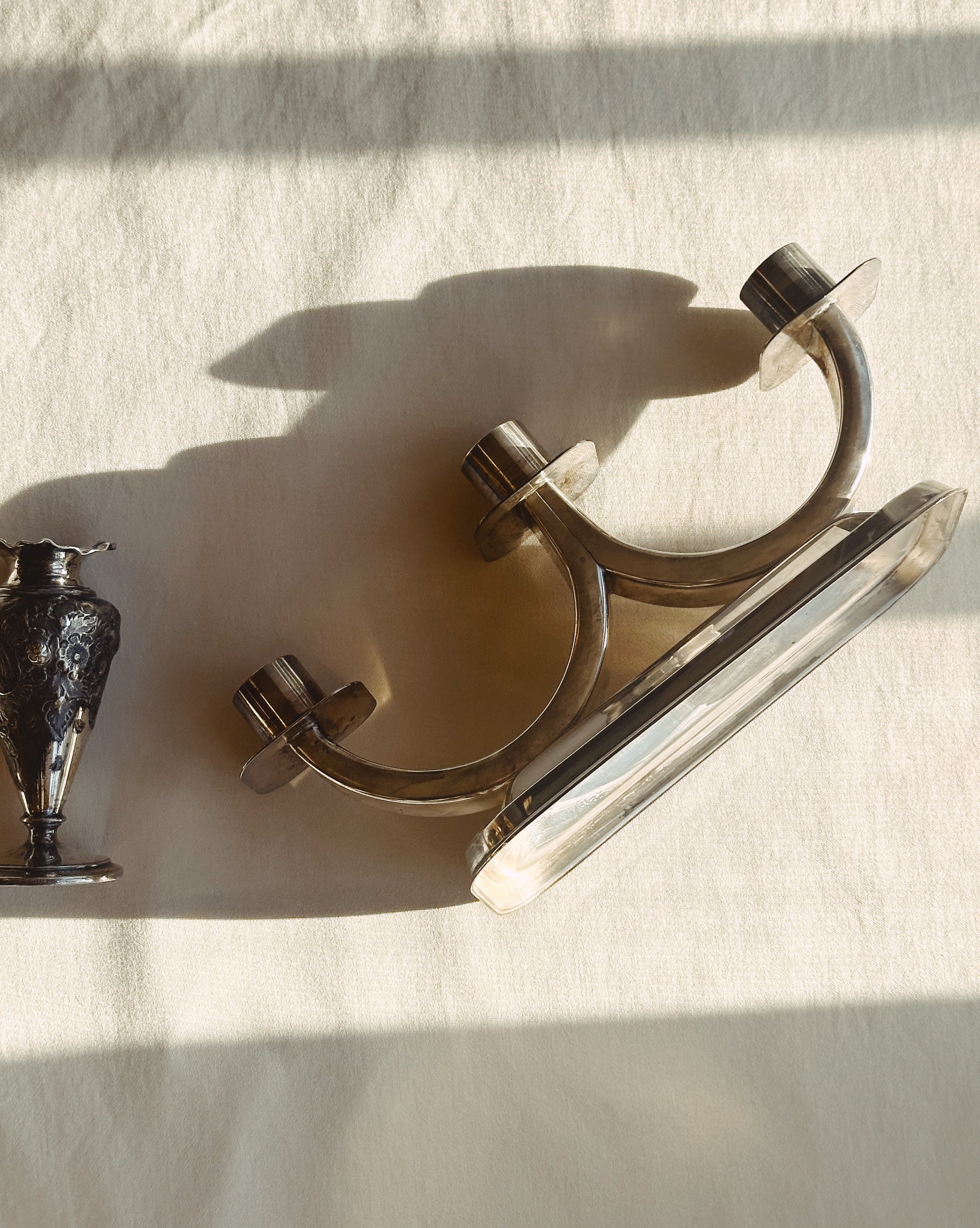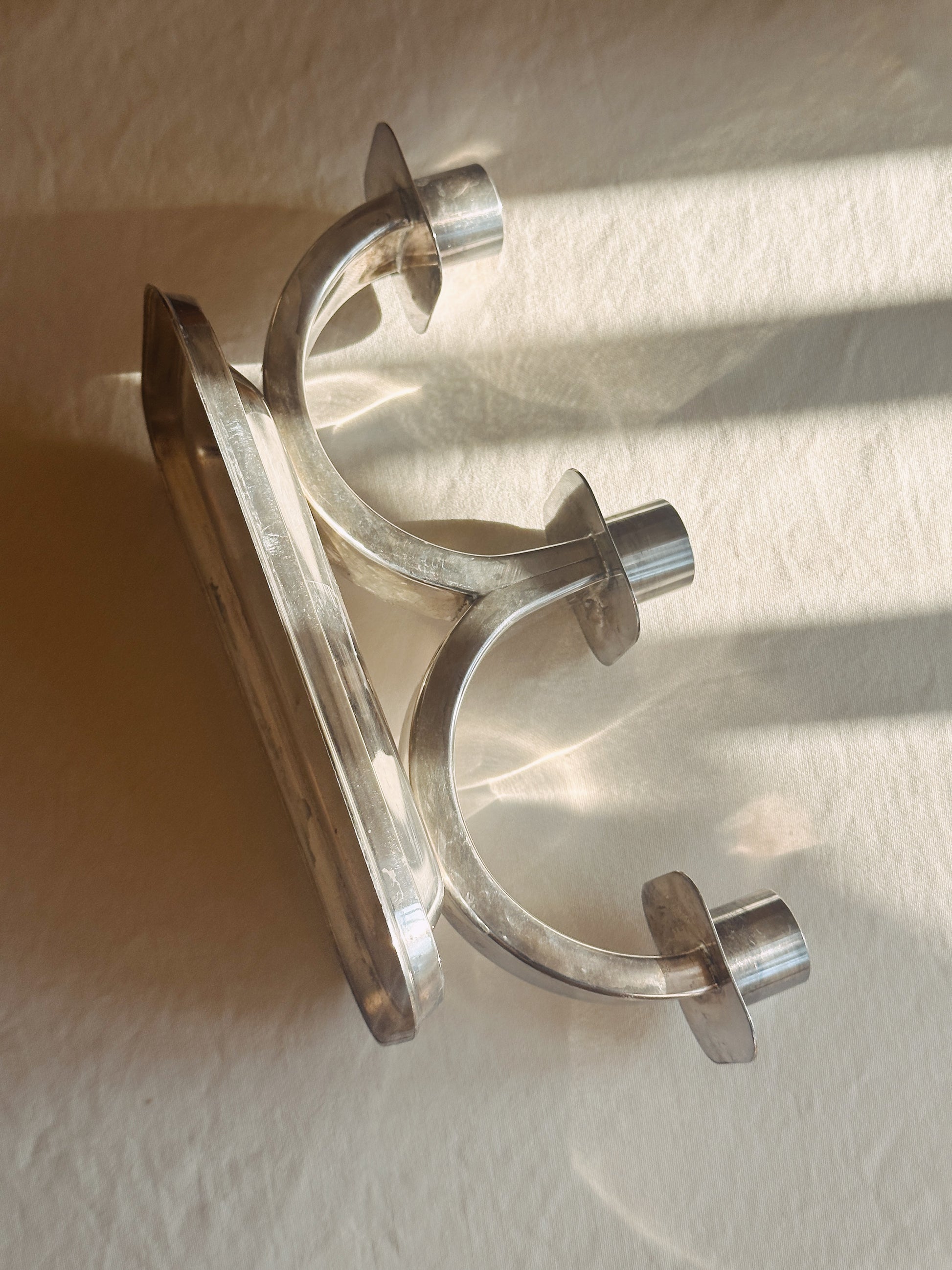 A mid century, silver plated candelabra. Good vintage condition, with minimal signs of wear. 10.5” wide and 5” at tallest. Hold a standard taper candle. Two available, sold individually.