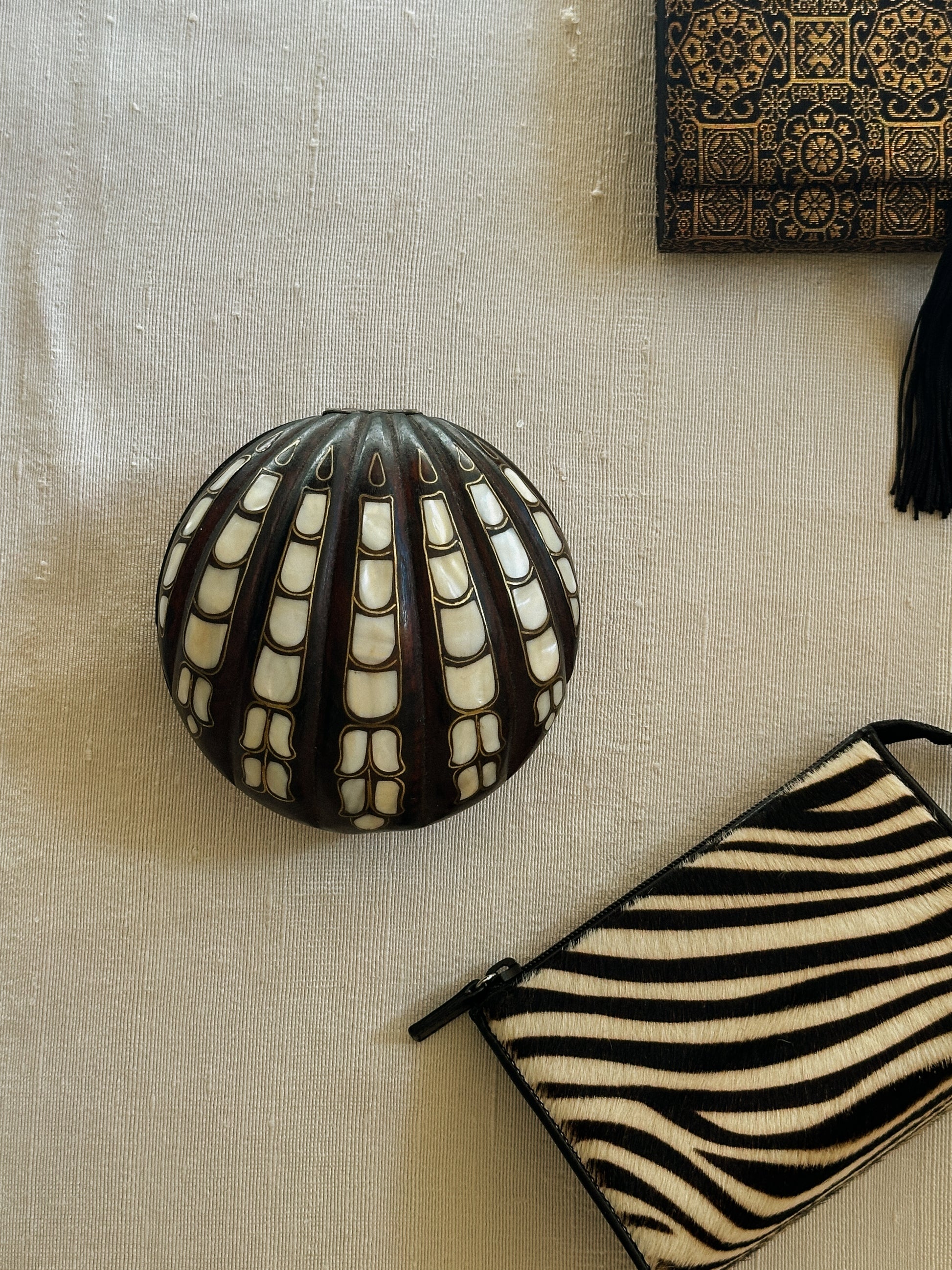 A beautifully crafted vanity box in a shell form, with rich dark wood, mother of pearl inlay, and red velvet interior. 6” x 6.5”. Overall good vintage condition with signs of wear consistent with age.