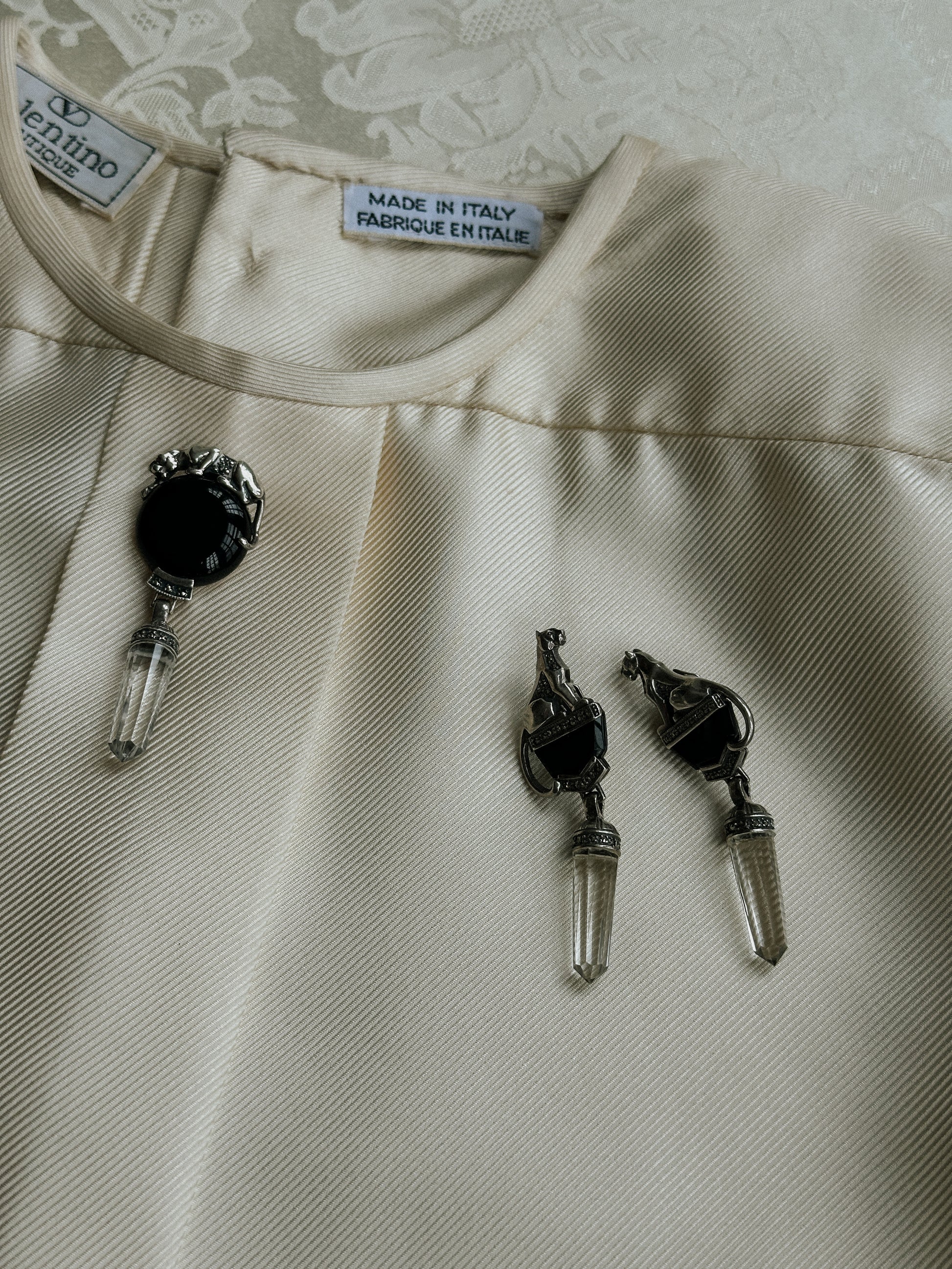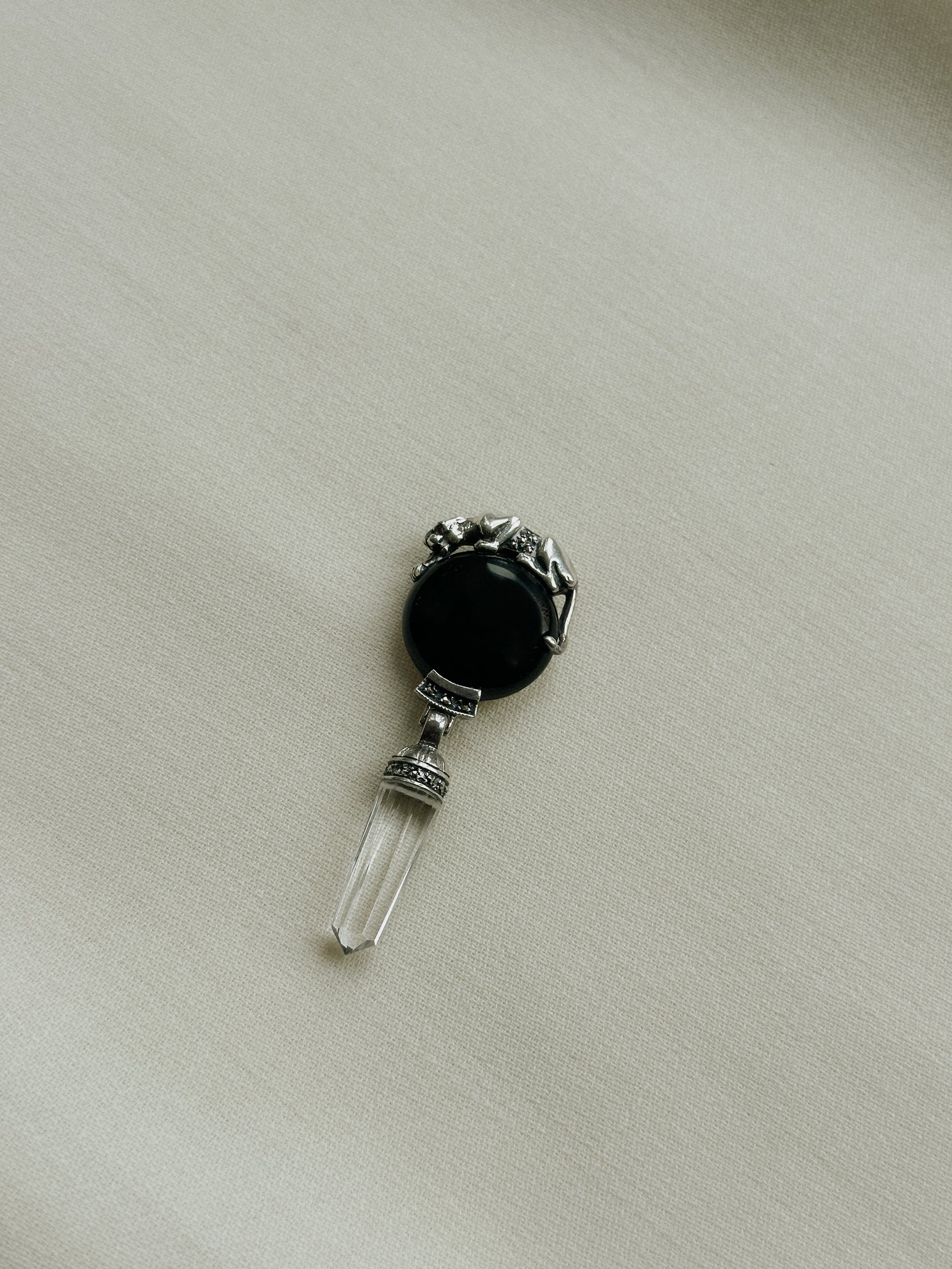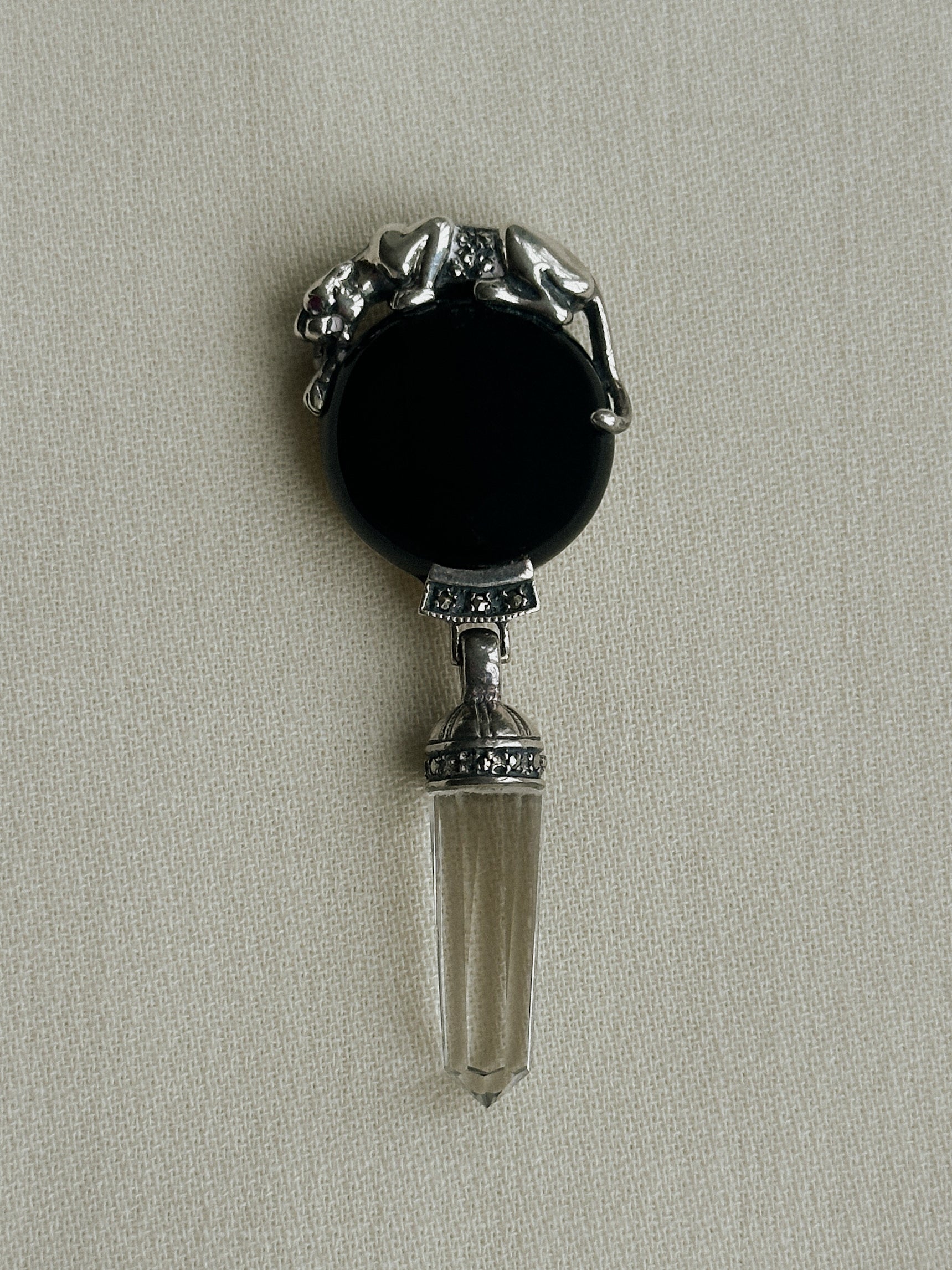 A vintage Ari D Norman onyx, sterling silver, and crystal brooch pin, featuring a panther with ruby eye. 3” long and in very good vintage condition.