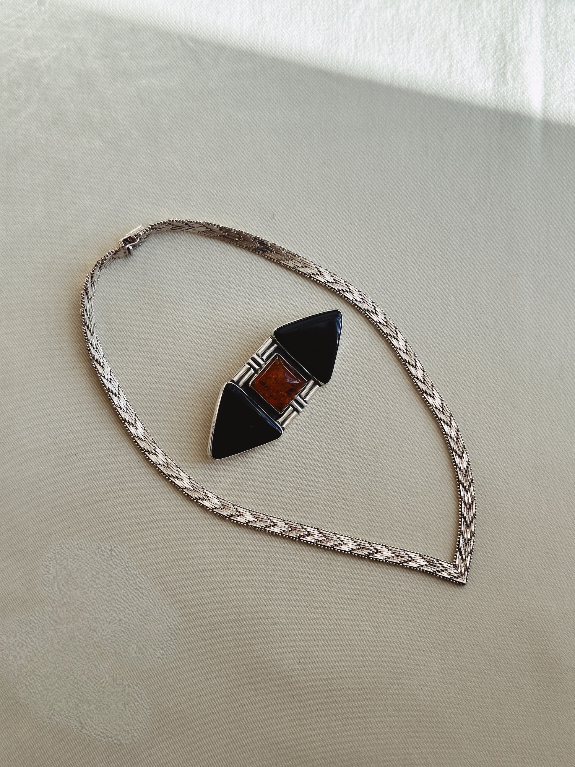 A vintage woven sterling silver necklace. The necklace sits gracefully along the collarbone and tapers gently at the center. 16” long end to end. Very good vintage condition.