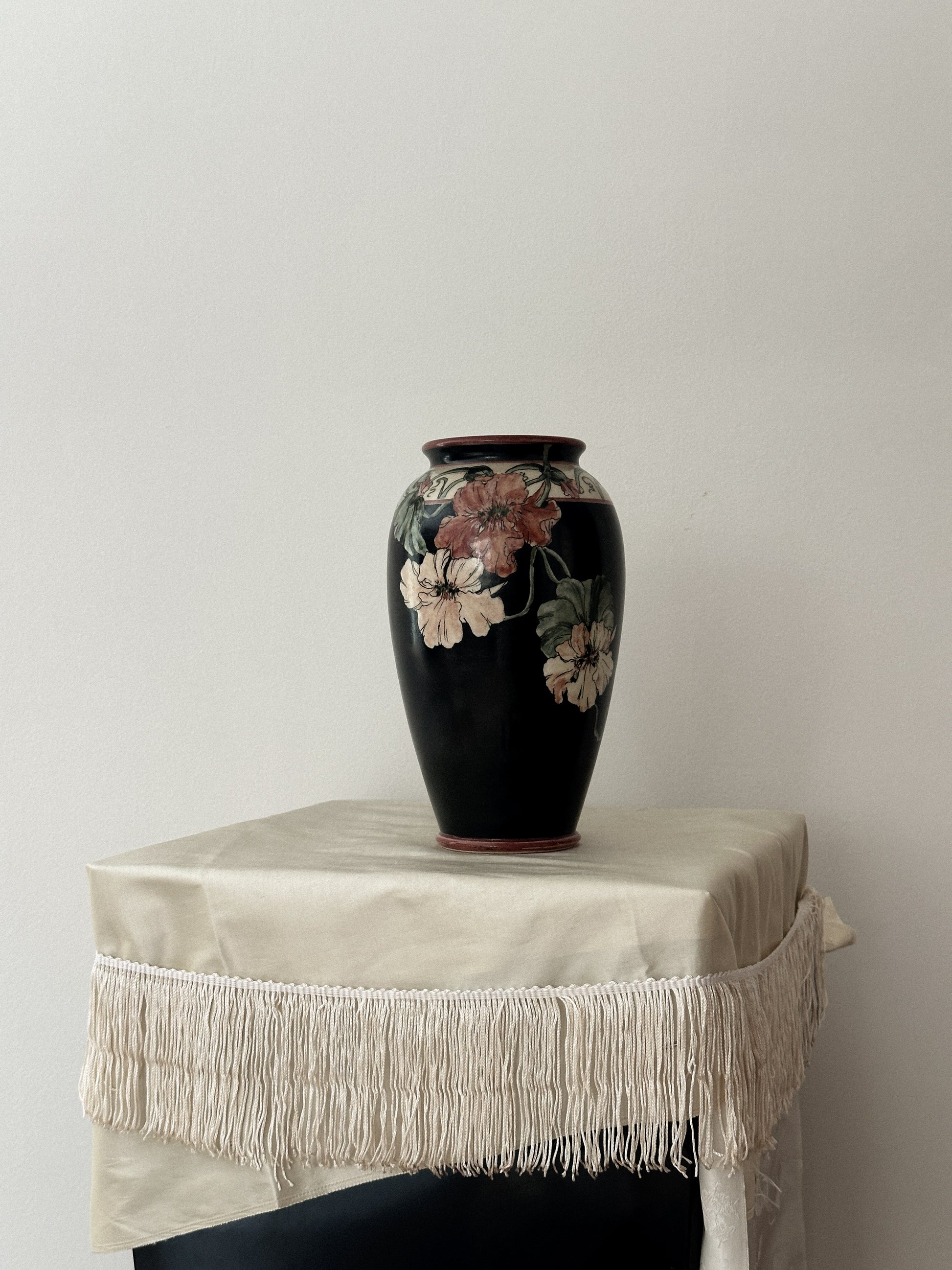 Beautiful hand-thrown studio art pottery vase with poppy floral motif. Black with pink flowers. Artist signed, 1982. 10”tall and 5” diameter. Excellent vintage condition.